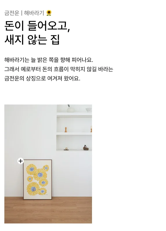 처음이시라면 부담 없이 시작할 수 있는 작은 소품을 추천합니다. 현관에 둘 수 있는 작은 해바라기 그림이나, 거실 테이블에 놓을 수 있는 금전수 화분, 또는 침실에 둘 수 있는 한 쌍의 작은 장식품 등이 좋습니다. 뚜누 기획전에서 제안하는 풍수 인테리어 소품들을 둘러보시면서 마음에 드는 아이템으로 좋은 기운 인테리어를 시작해보세요.